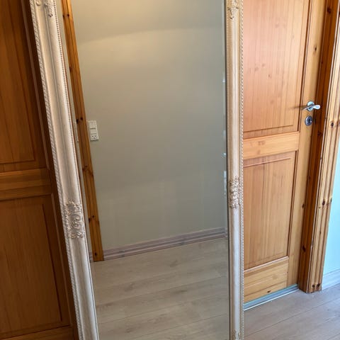 Jysk spejl med ornamenteret hvid ramme. Rektangulært vægspejl med dekorative detaljer i rammen. Velegnet til ophæng i entre, soveværelse eller stue, hvor der er behov for et større spejl med klassisk udtryk.