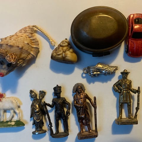 Samlefigurer, Sættekasse samling, Gamle ting til sættekassen. Sælges kun samlet. Pistolen er af metal. Figuren er af tin. Og så er der en Wade figur.