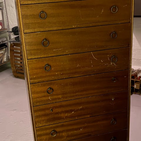 Kommoden er formentlig fra 40'erne. Den er i god stand, men en god gang politur ville gøre underværker. Flotte bronzebeslag. Marmorpladen er flækket men ser nogenlunde ud. Se billederne