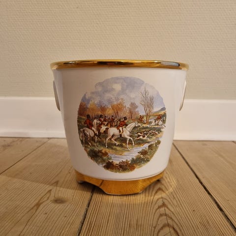 Fajance, Urtepotteskjulere , Søholm, Bornholm, 2 fine, gule, riflede urtepotteskjulere med guldkant og renæssance-motiver. Urtepotteskjulerne er fra 1950’erne og i meget fin stand. Indvendigt er der dog lidt spor fra planter. Den store er 16 cm i Ø og 13 cm høj, den lille 13 cm Ø og 10,5 cm høj. Prisen for den store er: 225 kr, den mindre 175 kr.