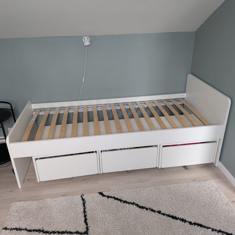 IKEA enkeltseng børneseng i hvidlakeret metal. Inklusive madras hvis ønskes. Det er resårbunden der er 30 cm over gulvet. Sengegavlen er 118 cm høj.
