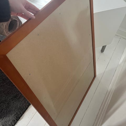 89 x 105 cm, øjensynligt håndlavet, med glas, har aldersspor og en fejl i nederste venstre hjørne (se foto). Bagbeklædningen er af tre og er gået i tre stykker (se foto)