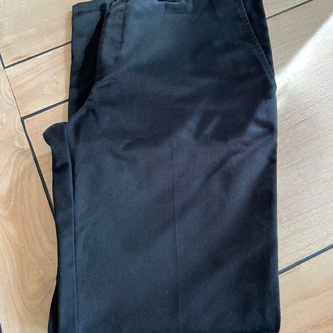 Dickies bukser til herre i sort bomuld og polyester. Bukserne er 36x34 og har klassisk pasform med fladt frontstykke. Velegnet som hverdags- eller arbejdsbukser. Materialet er bomuld og polyester, som giver et slidstærkt og behageligt stof. Bukserne har bæltestropper og lommer, som ses på billederne.