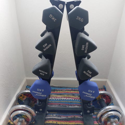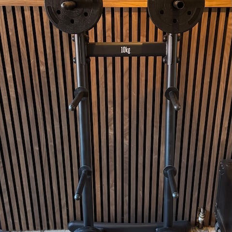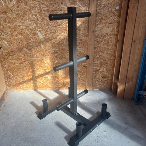 Vægtstativ til opbevaring af vægtskiver. Stativet er fremstillet i metal og er hvidt med sorte holdere til skiverne. Det er egnet til brug i hjemmetræningsrum eller mindre fitnessområder, hvor der er behov for organiseret opbevaring af vægtskiver på flere arme. Stativet placeres fritstående på gulvet op ad en væg.