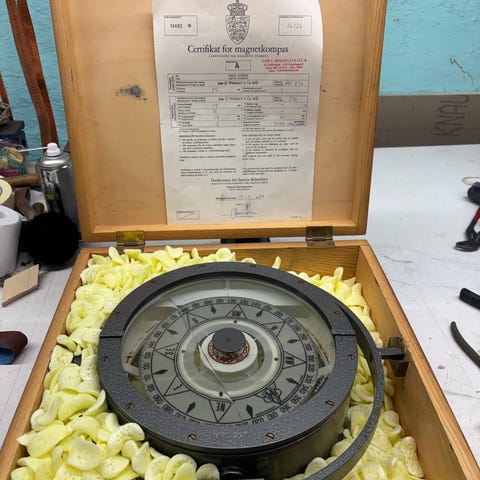 Lyth Stockholm skibskompas med rat og lanterner i messing og træ