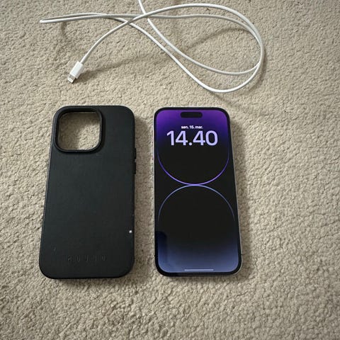 jeg har fået arbejdes mobil derfor sælger jeg min iphoen 14 pro ,som er som ny og. har lige fjernet panserglasset. cover og lader medfølger også. Har netop været til service, hvor den er blevet renset og fået spritnyt batteri, så den står mere eller mindre som ny. Ingen ridser i skærm. Har altid haft cover osv. på. batteri tilstand viser 100%