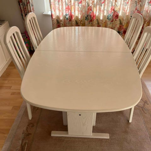 Fint spisebord og stole, der passer godt ind i et landkøkken. Bordpladen og stole har brugsspor, men fungerer fint. Bordet har 2 udtræksplader. Bordet måler 110 x 70 og pladerne 40 x 70. Nypris var kr. 10.000. Bud modtages.