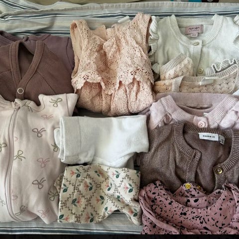 Flot tøjpakke med 15 stk babytøj til pige i str. 68, multifarvet. 9 stk. aldrig brugt. Sættet omfatter forskellige dele babytøj, herunder blandt andet bukser, bodyer, kjole og to trøjer, i flere farver og mønstre. Tøjet er egnet til daglig og finere brug for spædbørn i størrelse 68 og kan kombineres på forskellige måder. Materiale er ikke oplyst. ( se de enkelte annoncer):