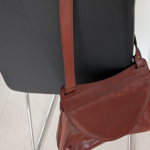 26x28cm varm brun læder. Indholdet flere rum. Lukkes med lynlås . En udvendige lomme med lynlås. Rummelig men elegant taske.