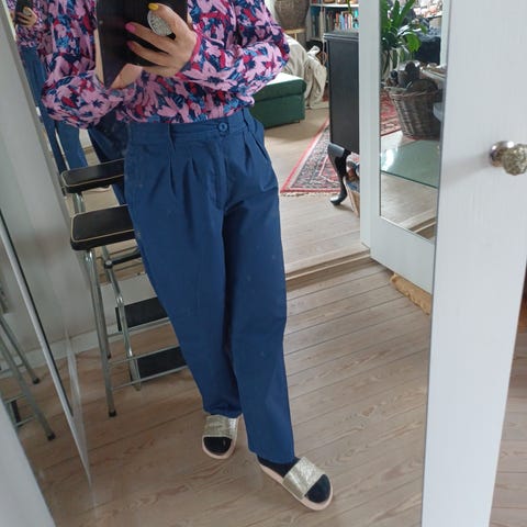 Blå hjemmesyet busker fra 1980erne vil jeg skyde på. Se venligst mål på billeder tak. Jeg er 158 cm høj og 50 kg. Der er elastik i linning bagpå.