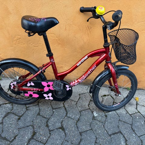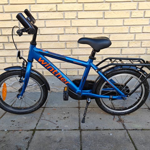 Winther børnecykel med 16" hjul i lilla farve. Cyklen har lav indstigning, forkurv og bagagebærer samt skærme for og bag. Velegnet som hverdagscykel til børn i den størrelse, der passer til 16" hjul.