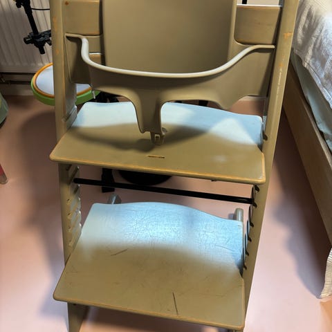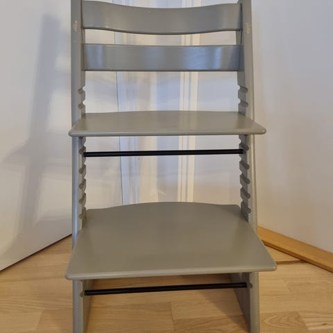 Stokke Tripp Trapp højstol i blåmalet træ. Højstolen har justerbar siddeplade og fodplade, som kan tilpasses barnets højde. Klassisk Tripp Trapp-design med slids i sædet til montering af tilbehør. Egnet som spise- og siddeplads til børn ved bordhøjde.