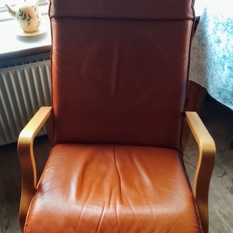 Lænestol i drejefod med sort polstret sæde og nakkepude. Sædet er udført i en kombination af læder og mesh-stof, som giver en let og åben rygflade. Stolen har høj ryg og integreret nakkestøtte for ekstra støtte. Understellet er i metal med rund fod, som sikrer stabilitet og mulighed for at dreje stolen. Velegnet som afslapningsstol i stue, læsehjørne eller kontor.