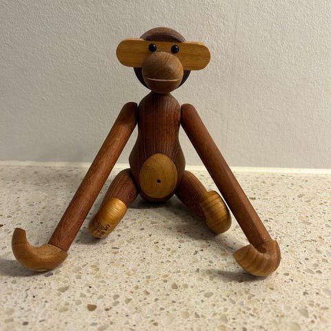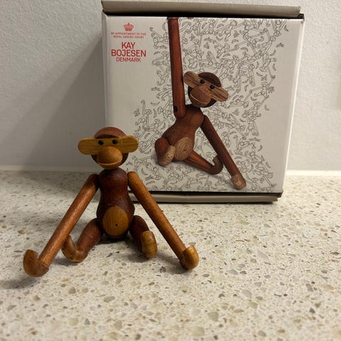 Kay Bojesen abe træfigur i lille størrelse. Figuren er udført i brunt træ med bevægelige arme og ben. Velegnet som dekoration i hjemmet eller som samleobjekt. Leveres med original æske, som viser samme model af aben.