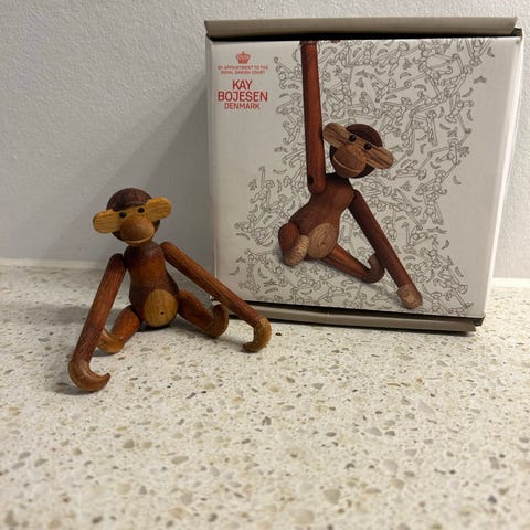Kay Bojesen abe træfigur i brunligt træ med lyse trædetaljer. Klassisk abe udført i massivt træ med bevægelige arme og ben. Egnet som dekoration i hjemmet, fx på hylde, reol eller børneværelse.