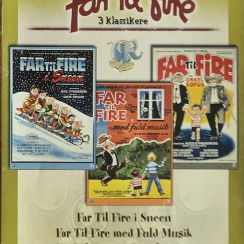 Far til fire DVD samling med flere danske spillefilm i serien. Forskellige titler fra Far til fire-universet samlet i ét parti. Alle film er med dansk tale og egner sig til familier og børn, der ønsker klassiske danske familiefilm på DVD.