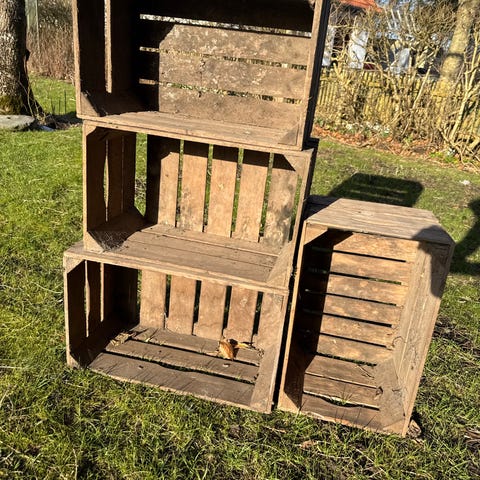 Trækasser x2 i rustikt træ. Kassen fremstår i et enkelt, klassisk design med lameller og åben front. Egnet til opbevaring, dekoration eller som lille reol/hylde. Kan bruges stående eller liggende på gulv eller møbel. Velegnet til fx bøger, planter, kurve eller andre mindre genstande i hjemmet.