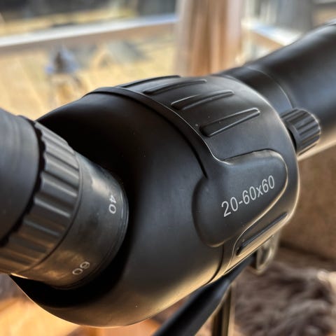 Spotting scope teleskop med zoomforstørrelse 20-60x og 60 mm objektiv. Kikkerten er monteret på et højdejusterbart trefodsstativ i metal med håndtag til justering af retning. Egnet til observation på mellem til lange afstande, f.eks. natur- og fuglekig eller generel udsigtsobservation. Sort kikkerthus og lyst stativ med teleskopben.