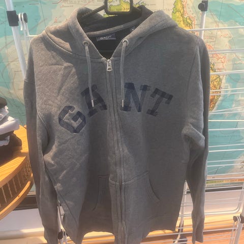 Brugt GANT hættetrøje til herre i størrelse XL. Trøjen er blå og fremstillet i bomuld. Den har lynlås foran, hætte med snøre og lommer foran. Stor GANT-logoapplikation på brystet.