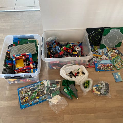 Ca 1 kg LEGO System klodser i blandede farver. Indeholder forskellige typer og størrelser af standardklodser egnet til fri byggeleg og udvidelse af andre LEGO System sæt.