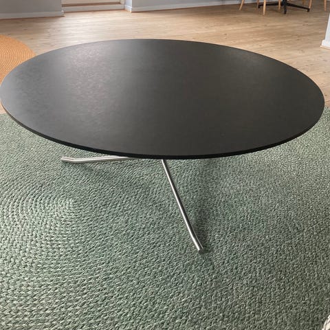 Hay rundt sofabord i sort træ. Bordet har rund bordplade og tre ben i bøjet træ. Egnet som sofabord eller sidebord i stue eller opholdsrum. Kan osse sættet sammen med lavere bord