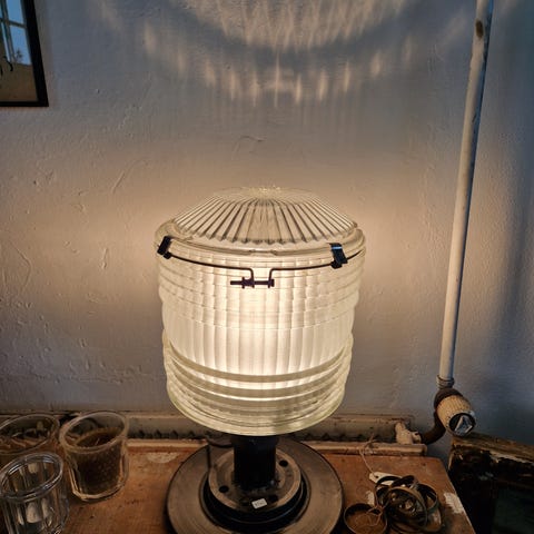 Den er professionelt lavet om til loftslampe og giver et fantastisk jævnt, fyldigt lys uden og blænde.