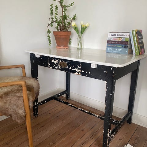 Skrivebord i massivt træ lakeret. Rektangulær bordplade med synlige træårer og planker. Bordet har lige, koniske ben og 2 små skuffer i langsiden til opbevaring.
