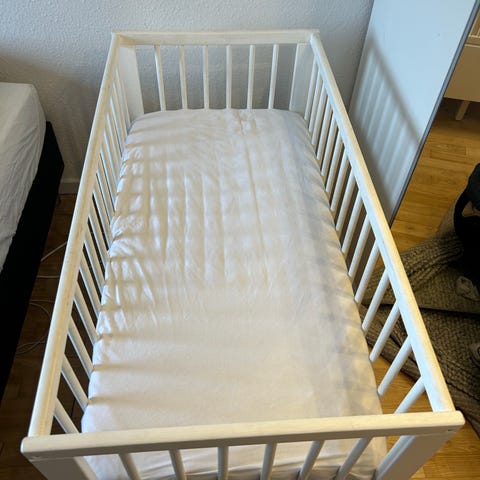 IKEA tremmeseng i hvid, hvor bunden kan sættes i to højder og den ene side kan tages af. To madrasser i forskellige tykkelser samt rullemadras, vådliggerlagen og almindeligt stræklagen følger med.