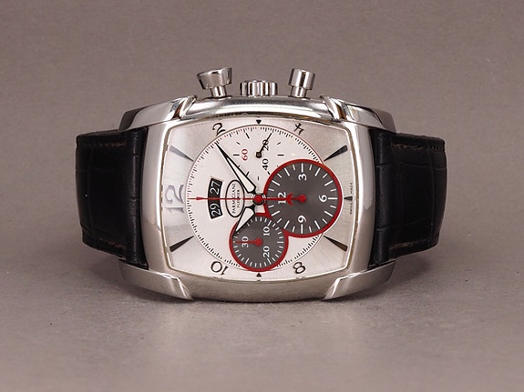 Uret har datovisning kl. 3 samt safirglas. Kassen er kombineret med en sort gummirem.