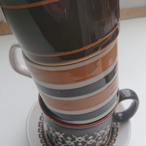 4 flotte vintage krus fra WP, Winchcombe Pottery, England. Produceret i 1970'erne.