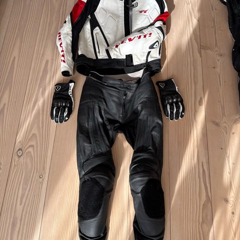 Rev’it motorcykel læderdragt i todelt design med jakke og bukser, der kan lynes sammen. Aftageligt for. Dragten er i læder med perforerede felter på jakken for ventilation.