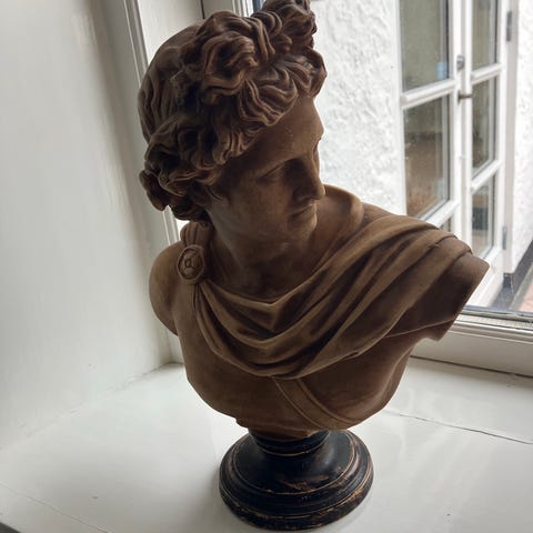 Tv: Buste af Zeus, de græske guders konge. Højde ca 12,5 cm. Kr 550,-