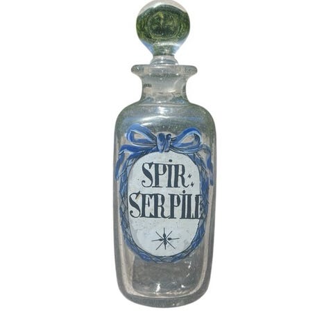 Holmegaard apotekerflaske med tekst “ Spir Cochlear” - mundblæst m/ håndmalet dekoration - signatur i bund - højde 22 cm i fin stand ingen afslag.