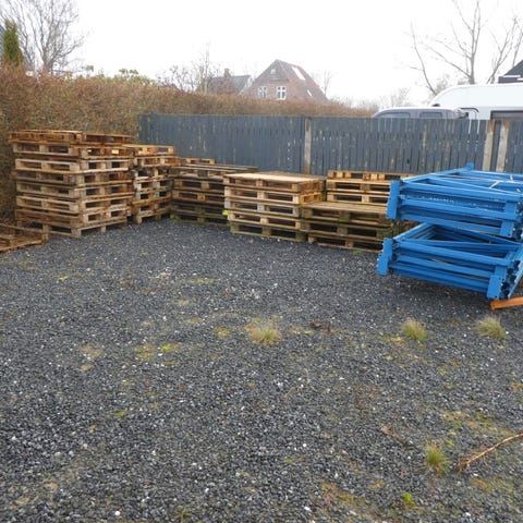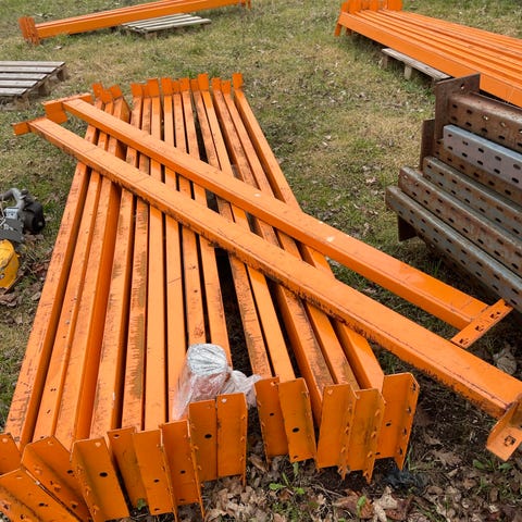 Pallereol lagerreol i metal med orange bjælker. Reolen er velegnet til opbevaring i lager, værksted eller garage, hvor der er behov for robust hylde- og pallereolopbevaring. Konstruktionen består af galvaniserede stolper og tværbjælker, som kan justeres i højden efter behov. Egnet til opbevaring af paller, kasser og andet tungt udstyr i erhvervsmæssige eller private lokaler.