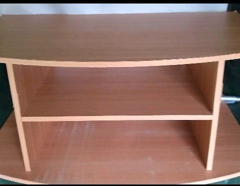 Rummeligt TV-bord/skab på hjul og med drejeplade. Lys melamin.