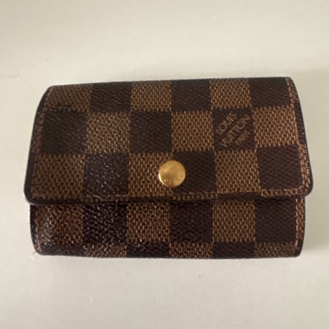Louis Vuitton nøgletaske i læder til kvinde. Tasken har klassisk monogram-yderside og brun læderinderside. Indvendigt er der metalbeslag med flere kroge til nøgler. Produktet er mærket med Louis Vuitton Paris, made in France. Velegnet til opbevaring og organisering af nøgler i en kompakt læderetui.