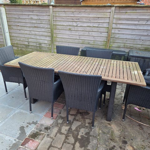 Havebord med udtræk og 2 positionstole i træ i brun farve. Sættet består af et rektangulært bord og to matchende stole. Velegnet til udendørs brug på terrasse eller have.