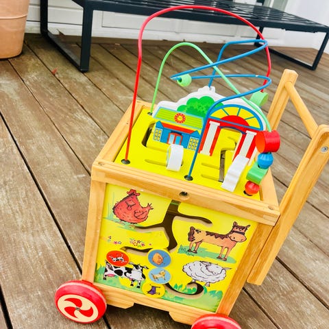 "Min gåvogn" og "min dukkevogn". Begge er udført i rødmalet træ med gule henholdsvis hvide detaljer samt metalhåndtag. Begge er velegnede som støtte til de første skridt for mindre børn samt som lege- og transportvogn indendørs eller udendørs på jævne underlag.