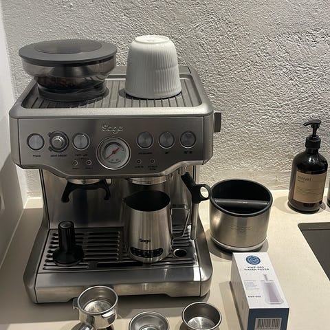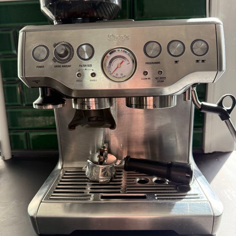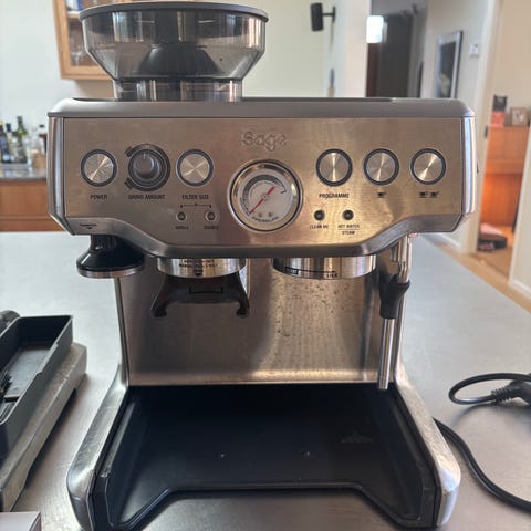 Sage Bambino espressomaskine i rustfrit stål med tilbehør. Sættet omfatter espressomaskine med damparm til mælkeskum, flere filterkurve, to portafilter-håndtag, to tamper og tilbehør til brygning. Der medfølger også en separat elektrisk kaffekværn nypris 599 samt beholder til kværnet kaffe. Velegnet til tilberedning af espresso og mælkebaserede kaffedrikke i hjemmet. Espressomaskinen virker, men der kommer ikke vand ud trods Decale af flere omgange, pakke med descaletabletter 16 stk medfølger