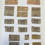 Produktene er billettkort fra danske rationeringssystemer. De har en papirkvalitet og er trykt med tekst i forskellige skrifttyper. Designet inkluderer datoer og beløb for rationerede varer. Farven er overvejende beige.,Bemærk at mail, chat og beskeder ikke besvares, og varen skal købes på knappen "Gå til varen"