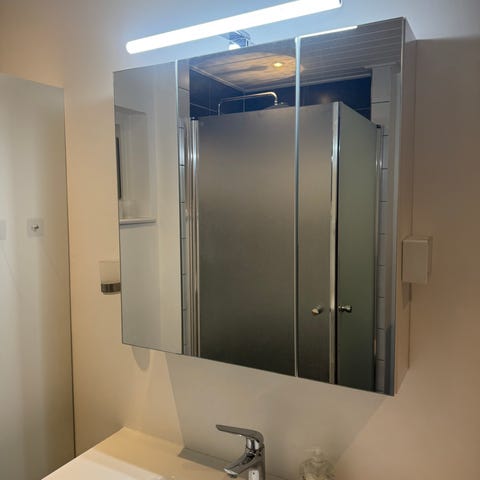 Spejlskab i eg i samme design som FAXÄLVEN fra Ikea. Bygget af snedker. 80x15x95 cm.