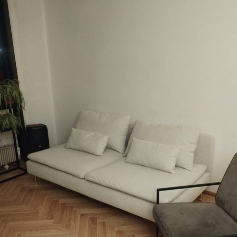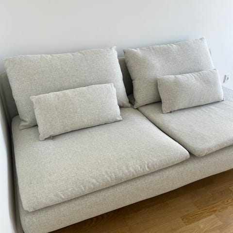 Sofaen har nogle år på bagen, men er enormt behagelig og kan rumme hele familien/vennerne. Det er muligt at vaske betrækket eller købe nyt betræk i forskellige farver fra IKEA, hvis man vil opgradere den.