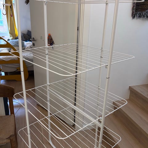 Rigtig smart stativ som kan bruges som tørrestativ eller tøjstativ, det er foldbar så alle hylder kan foldes ind så det ikke fylder meget når det ikke bruges. Der er 8 alu stænger i hvert niveau + ekstra bøjler i siderne øverst, så du får masser af plads til vasketøjet. Tørrestativet er adskilt og skal samles før i brugtagning