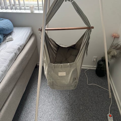 babyhængevugge i naturfarvet bomuld. Hængevuggen monteres i loftet med krog og fjeder og har træstang til stabil ophængning. Indvendig polstret madras/indsats giver støtte og komfort til baby. Velegnet som sove- og hvileplads til spædbørn. Materiale i tekstil, aftagelig vuggedel der kan tages ned fra ophænget efter behov.