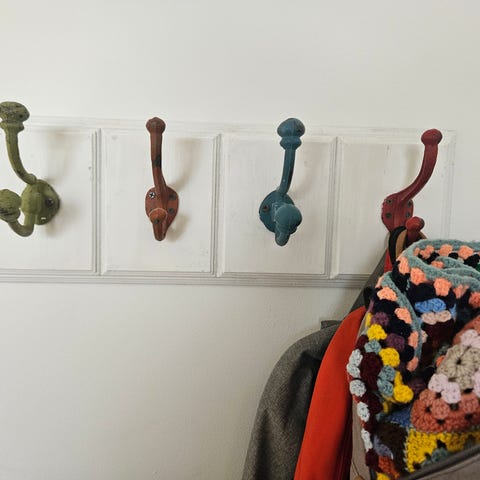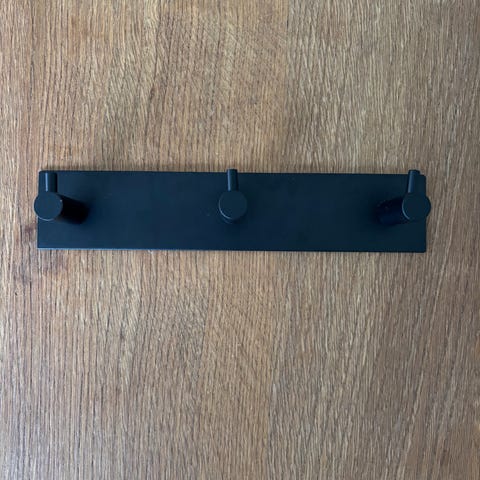 Klassisk knagerække med 4 dobbeltknager. Lavet i stål, der er pulverlakeret, og denne er hvid. Knagerækkens fire knage er dobbelte, hvilket giver mange kroge til at hænge overtøj, tørklæder, taske o. s. v. Mål: B: 54,5 cm. H: 13 cm. D: ca. 7 cm. God brugt stand med patina / se foto nr. 8/. Fra ryge- og dyrefrit hjem. Gode P forhold ved afhentning på adressen.