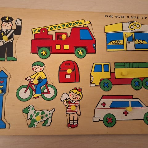 Kreativ Leg træpuslespil med dyremotiver. Puslespillet består af en træplade med udskårne felter og løse, farverige brikker formet som forskellige dyr, blandt andet løve, flodhest, elefant, tiger, giraf og påfugl. Brikkerne er tykke og nemme at holde om for små hænder. Motivet på pladen viser et landskab, hvor dyrene kan placeres i de tilhørende fordybninger. Velegnet som aktivitetslegetøj til mindre børn til træning af finmotorik og formgenkendelse.