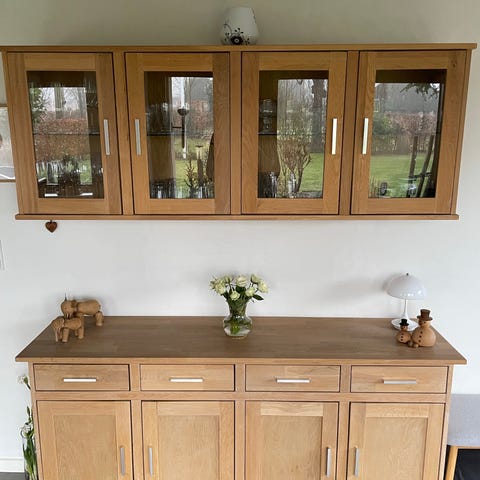 Vi sælger dette fine egetræssæt med to underskabe og et overskab med glaslåger i massivt egetræ.