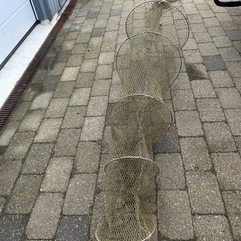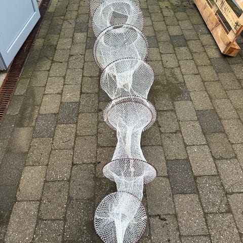 Flere ruser i forskellige længder og farver, med buede netbuer og indgangsåbninger til fangst af fisk eller ål. Ruserne er forbundet med net og flydekugler langs kanten, egnet til brug i sø, å eller kystnært vand. Fremstillet i netmateriale med metal- eller