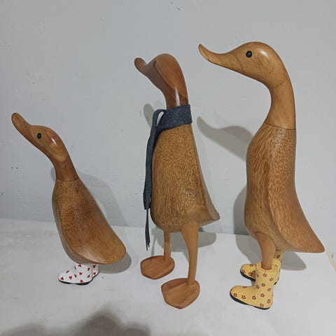 Sæt med tre træænder og én lille fugl i træ, alle udført i lyst træ. Figurerne har malede gummistøvler i forskellige farver og mønstre. Velegnet som dekoration i stue, børneværelse eller andre rum, hvor man ønsker et humoristisk og dekorativt indslag. Kan placeres samlet som et lille miljø eller fordeles enkeltvis på hylde, vindueskarm eller reol.