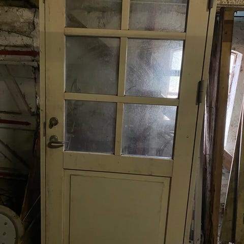 Terrassedør/foldedør med fire døre, som hver har 10 ruder. Enkelt lag glas. Meget charmerende og fint udført med kit og tynde sprosser. Velegnet til fx udestue, orangeri, kolonihave eller anneks, da ruderne ikke er isolerede. Der findes ikke en egentlig karm. Nu er dørene monteret på en ramme af 2/4 reglar, som kan medfølge.